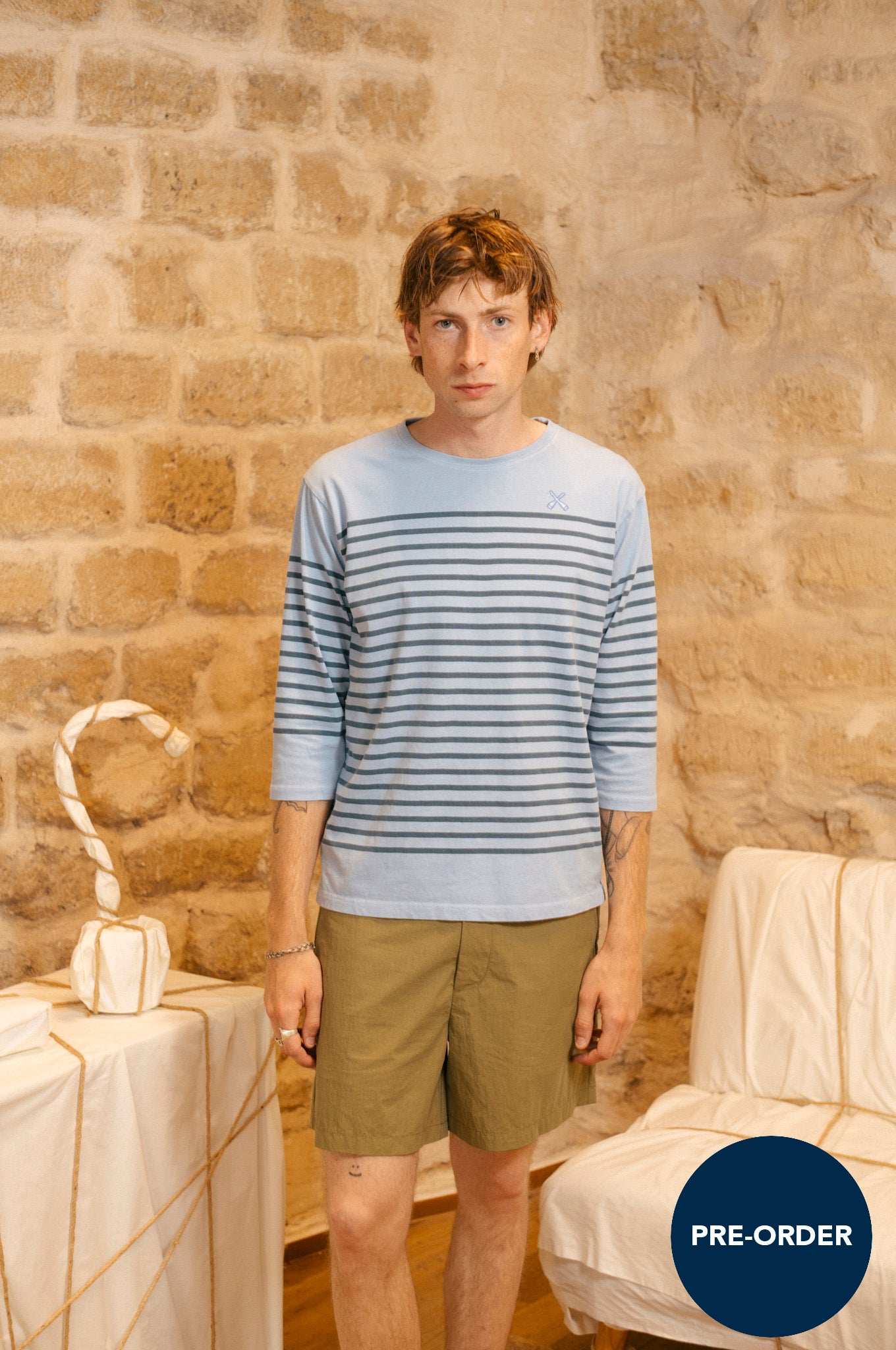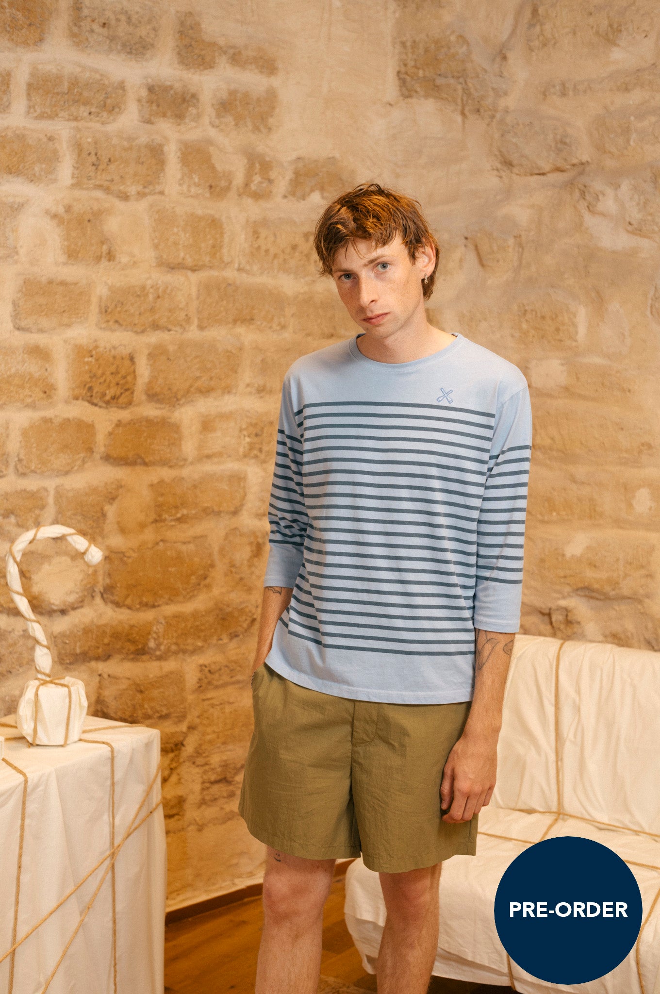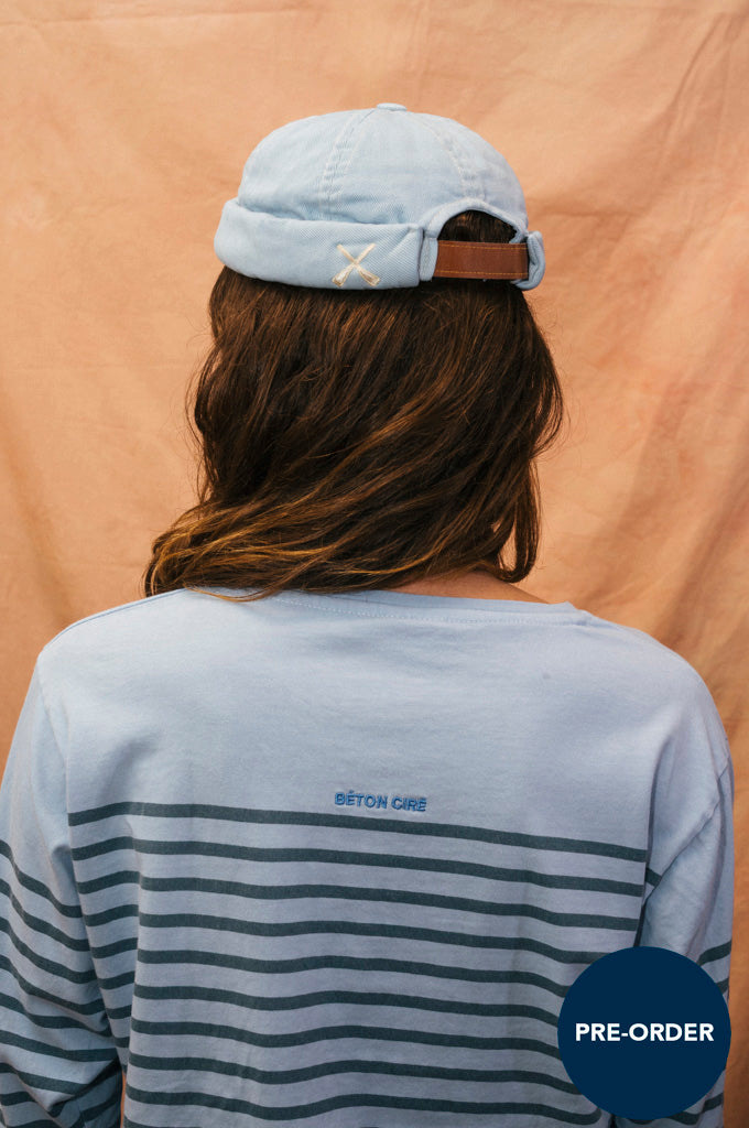 A timeless staple of the maritime wardrobe, the sailor top joins our Éléments capsule in a freshly dyed version. Sourced from a vintage French brand, each top starts out white with classic blue stripes — before being dyed in the same bath as our mikis, bandanas, sweatshirts, t-shirts, and pouches.