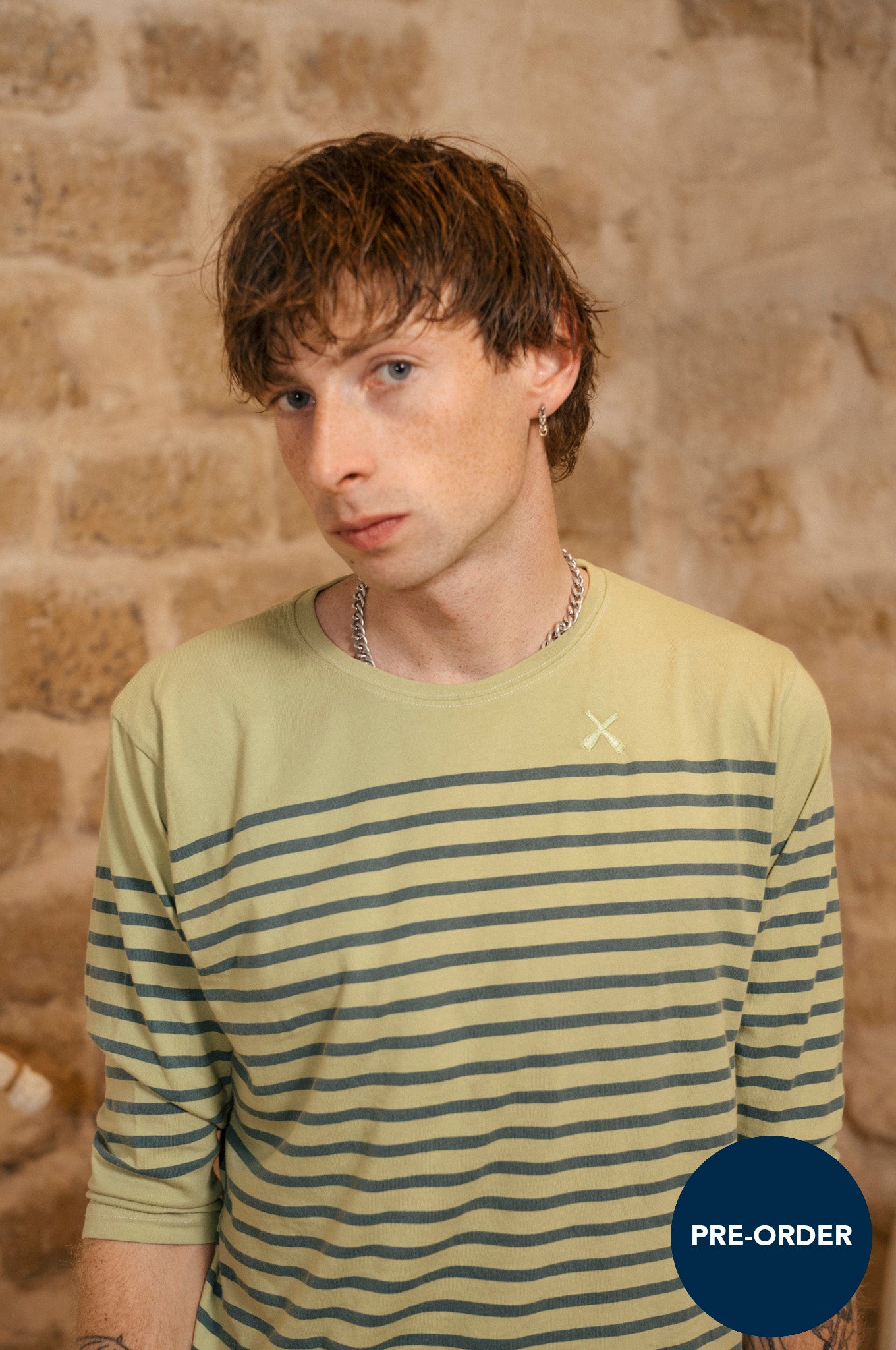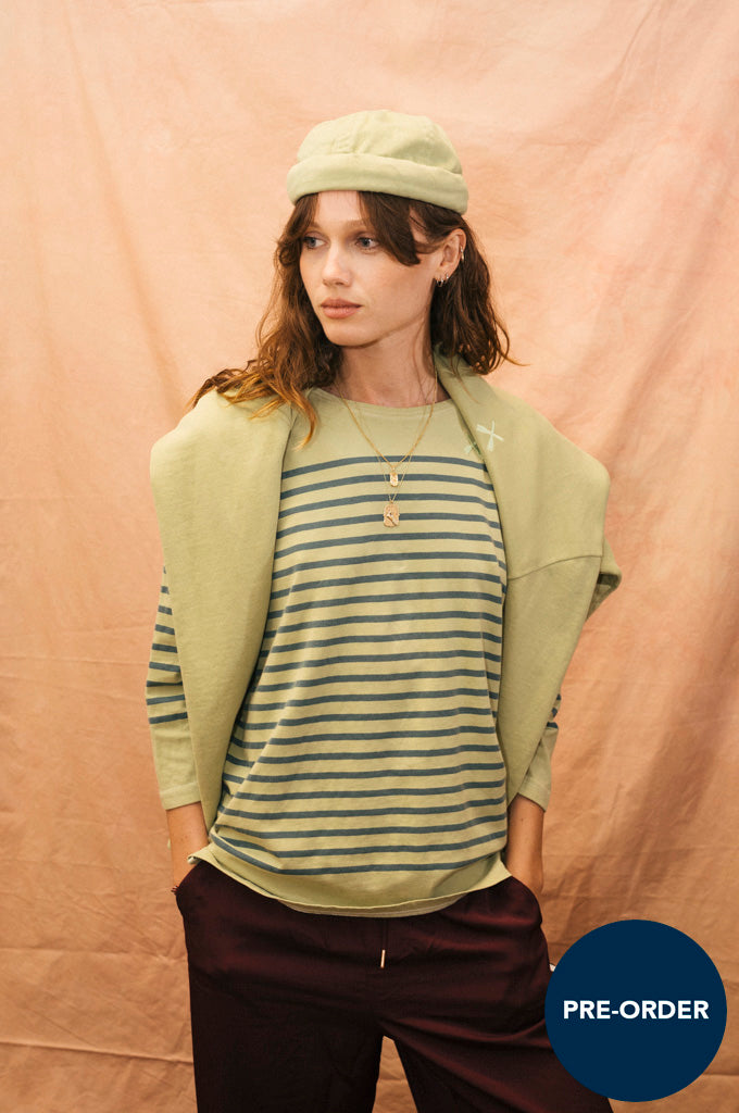 A timeless staple of the maritime wardrobe, the sailor top joins our Éléments capsule in a freshly dyed version. Sourced from a vintage French brand, each top starts out white with classic blue stripes — before being dyed in the same bath as our mikis, bandanas, sweatshirts, t-shirts, and pouches.