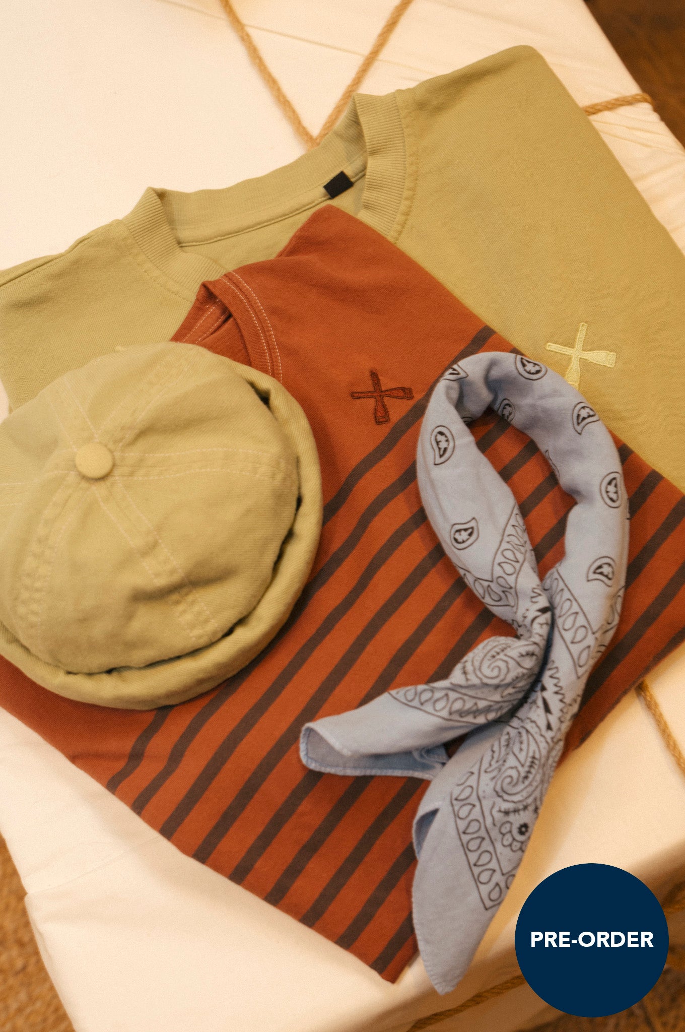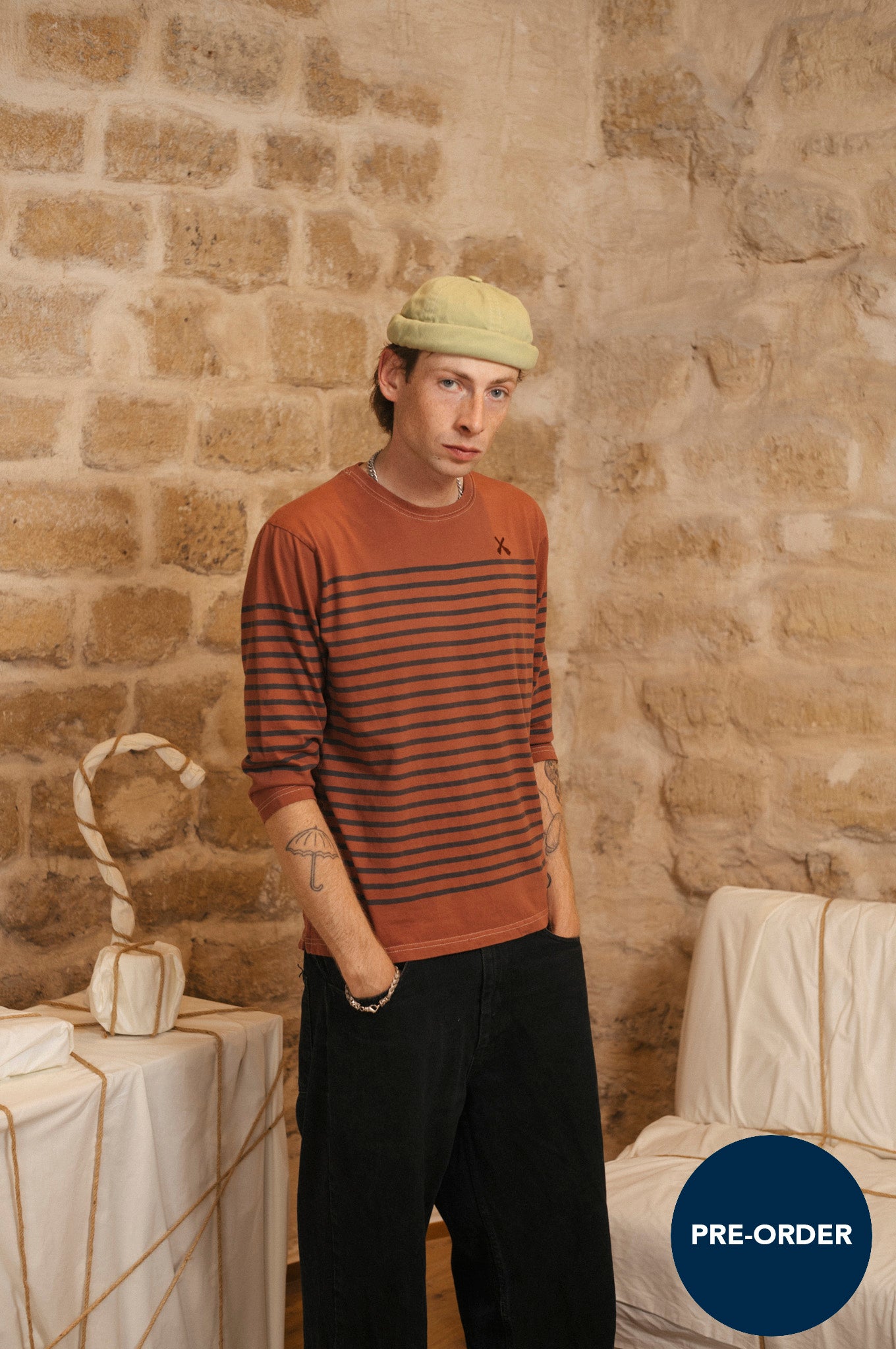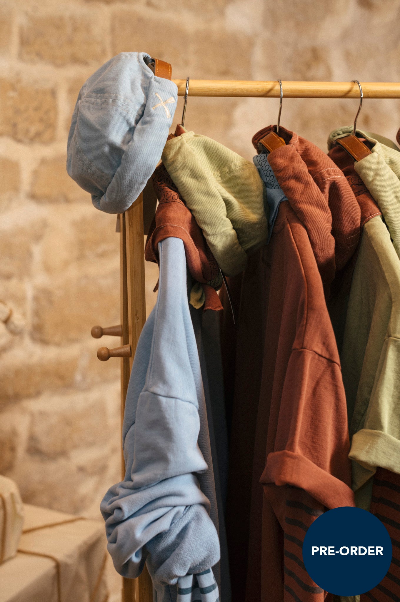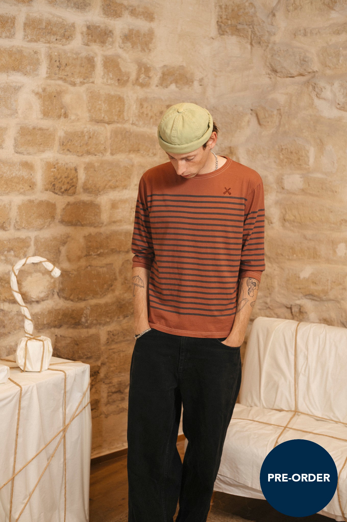 A timeless staple of the maritime wardrobe, the sailor top joins our Éléments capsule in a freshly dyed version. Sourced from a vintage French brand, each top starts out white with classic blue stripes — before being dyed in the same bath as our mikis, bandanas, sweatshirts, t-shirts, and pouches.